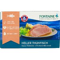 Fontaine Heller Thunfisch wird nach den Richtlinien der Nachhaltigkeit einzeln mit der Angelrute aus dem Wasser gezogen. Nach dem Handangelfang folgen die verantwortungsvolle Verarbeitung und die Verfeinerung mit besten Bio-Zutaten. Diese Vollkonserve enthält neben dem Thunfisch ausschließlich Meersalz und kalt gepresstes Bio-Sonnenblumenöl aus deutscher Ölmühle.